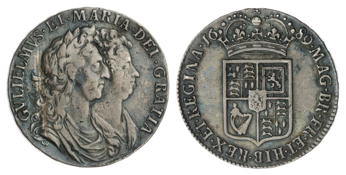 William and Mary (1688-1694), Halfcrown, 1689 PRIMO, first conjoined busts right, rev. second crowned shield, no pearls and no frosting, seven strings to harp, upwards lettered edge, 14.72g, 6h (Bull 846; ESC 512; Spink 3435), rub to high points and some scratches, otherwise darkly toned, bolder fine
