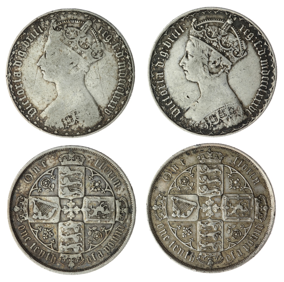 Victoria (1837-1901), 'Gothic' Florins (2), 1885, crowned Gothic bust left, rev. crowned cruciform shields, milled edge, 11.29g, 6h (ESC 861; Bull 2908; Spink 3900); another, 1886, 11.09g, 6h (ESC 863; Bull 2911; Spink 3900), both cleaned, the first scratched, fine (2)