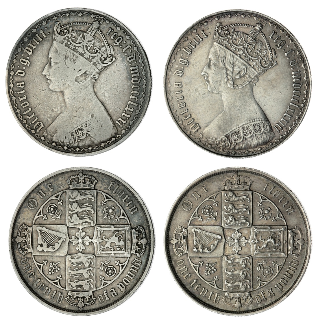 Victoria (1837-1901), 'Gothic' Florins (2), MDCCCLXXXI [1881], crowned bust left, rev. crowned cruciform shields, milled edge, 11.13g, 6h (ESC 856; Bull 2902; Spink 3900); another, MDCCCLXXXIII [1883], similar, milled edge, 11.29g, 6h (ESC 859; Bull 2905; Spink 3900), the first mostly flat to the bust, yet dark toning in parts, fine / about very fine, the second with some contact marks to the obverse, yet lightly toned, very fine (2)