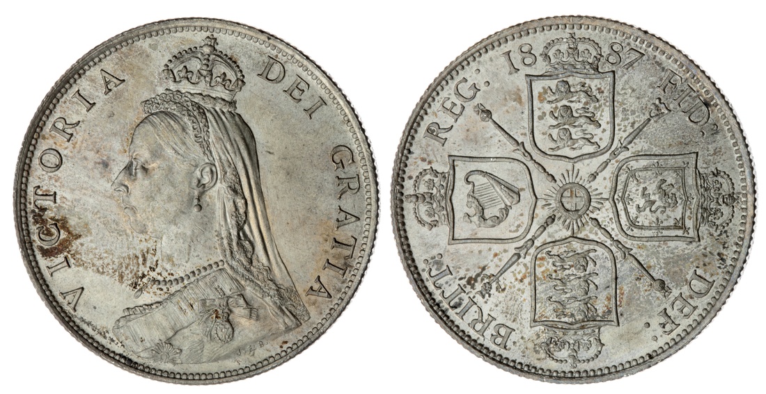 Victoria (1837-1901), 'Jubilee' Florin, 1887, crowned head left, rev. crowned cruciform shields, sceptres in angles, milled edge, 11.30g, 12h (ESC 868; Bull 2953; Spink 3925), some very faint contact marks to the obverse, otherwise with the most pleasing lustre and areas of toning, near uncirculated