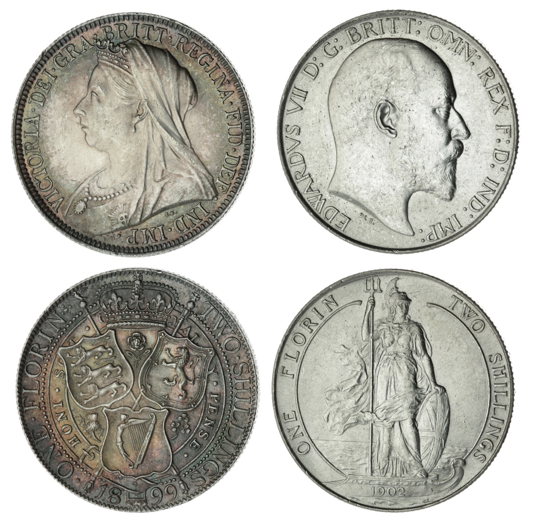 Florins (2) | Victoria (1837-1901), 'Old Head' Florin, 1899, veiled bust left, rev. three crowned shields within Garter, milled edge, 11.33g, 12h (ESC 883; Bull 2969; Spink 3939), hairlines scratches to obverse field and bust, otherwise darkly toned and with some lustre, bold very fine; Edward VII (1901-1910), 'Standing Britannia' Florin, 1902, bare head right, rev. Standing Britannia, milled edge, 11.29g, 12h (ESC 919; Bull 3577; Spink 3981), bright yet residually lustrous, bold very fine (2)