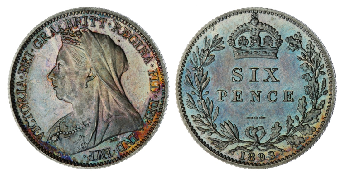 Victoria (1837-1901), 'Old Head' Proof Sixpence, 1893, veiled head left, rev. crowned denomination within wreath, milled edge, 2.80g, 12h (ESC 1763; Bull 3286; Spink 3941), with the most pleasingly brilliant and glass-like surfaces, toned in hues of blue and ochre, a most handsome as struck example