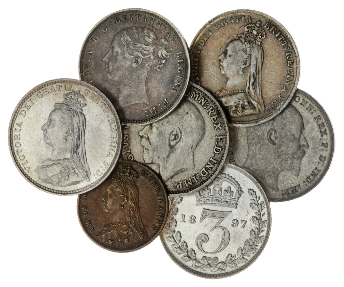 Collection of Silver Threepences and Toy Money (7) | Victoria (1837-1901), Threepence, 1886; 1887; 1893; 1897 (Spink 3914D; 3931; 3942); 'Toy Money' Jubilee Sovereign, struck in base metal, 1887; Edward VII (1901-1910), Matte Proof Threepence, 1902 (Spink 3984); George V (1910-1936), Threepence, 1917; (Spink 4015), the Matte Proof with a small scratch to head, otherwise as struck, the rest mostly lustrous, from about very fine to extremely fine (7)
