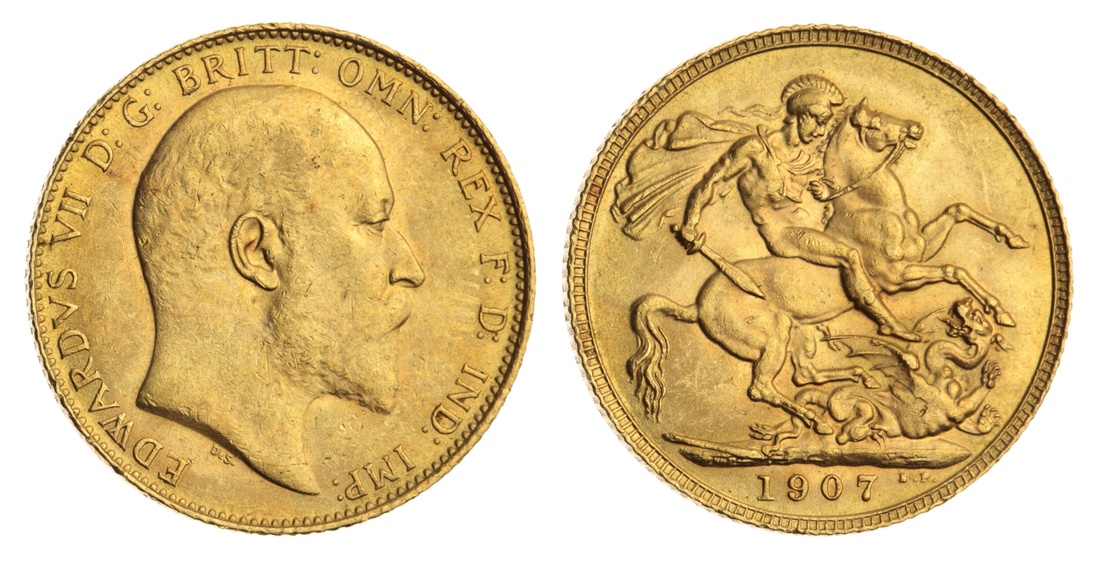 (g) Edward VII (1901-1910), Sovereign, 1907, bare head right, rev. St George and dragon, milled edge, 12h, 7.99g (Marsh 179; Spink 3969), lightly contact marked yet residually lustrous and with some toning spots, bolder very fine