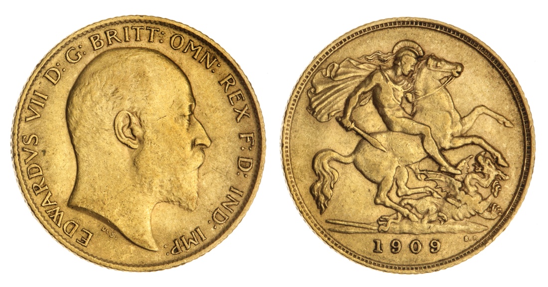 (g) Edward VII (1901-1910), Half Sovereign, 1909, bare head right, rev. St George and dragon, milled edge, 12h, 4.04g (Marsh 181; Spink 3974B), faintly contact marked, yet with some lustre to legends, very fine
