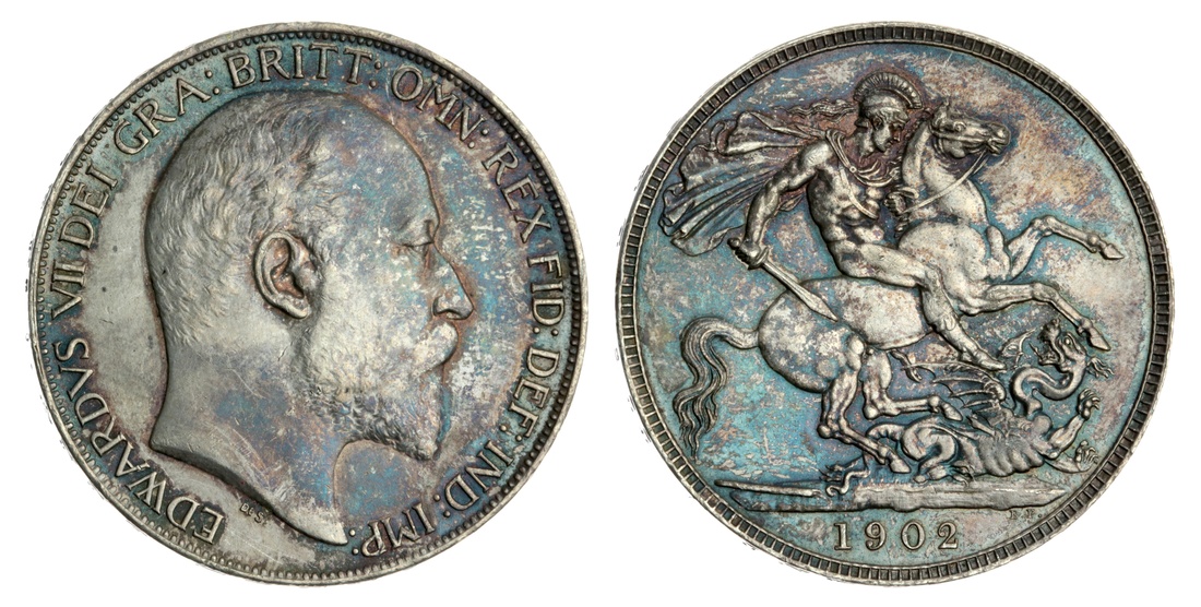 Edward VII (1901-1910), Crown, 1902 II, bare head right, rev. St George and dragon, upwards lettered edge, 12h, 28.33g (ESC 361; Bull 3560; Spink 3978), some faint nailmarks, most notably to the neck, otherwise richly toned surfaces in hues of ochre and blue, about extremely fine
