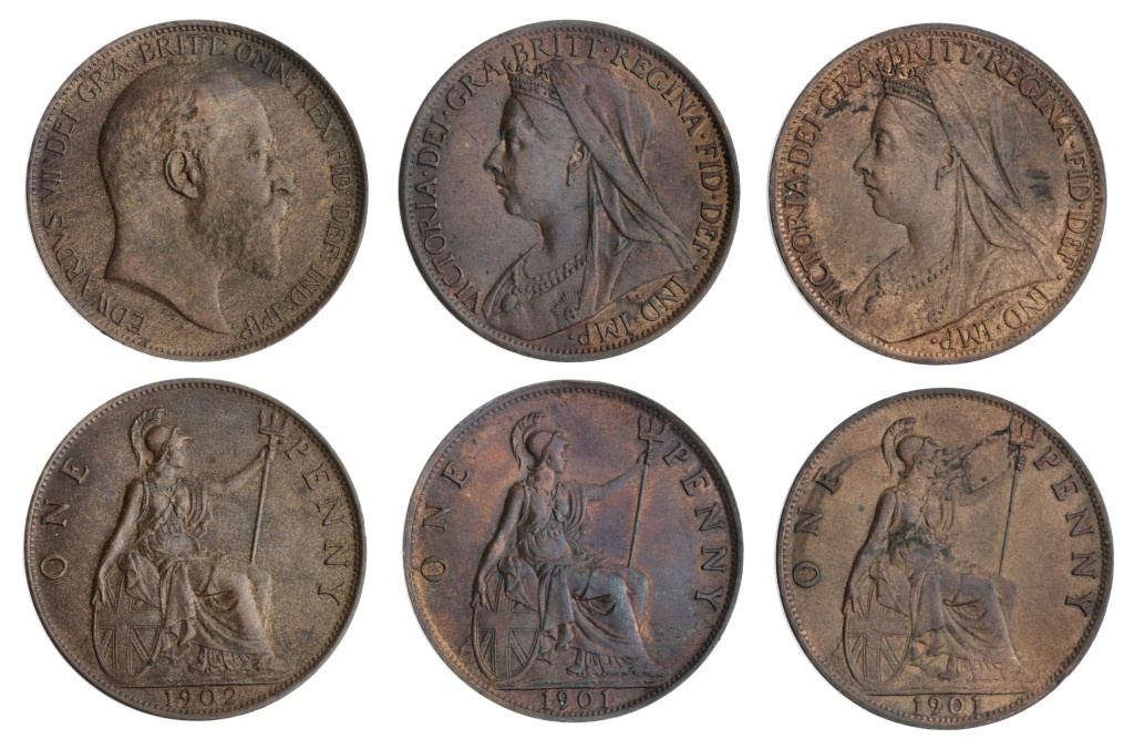 Pennies (3), Victoria (1837-1901), Penny, 1901 (2), old head left, rev. Britannia seated right, dies 1 and B (Freeman 154; Spink 3961), the first lightly scratched, toned, the second with more mint red, both bold very fine; Edward VII, Penny, 1902, bare head right, rev. Britannia seated right (Spink 3990), patch of verdigris to reverse, carbon mark across obverse, good very fine (3)