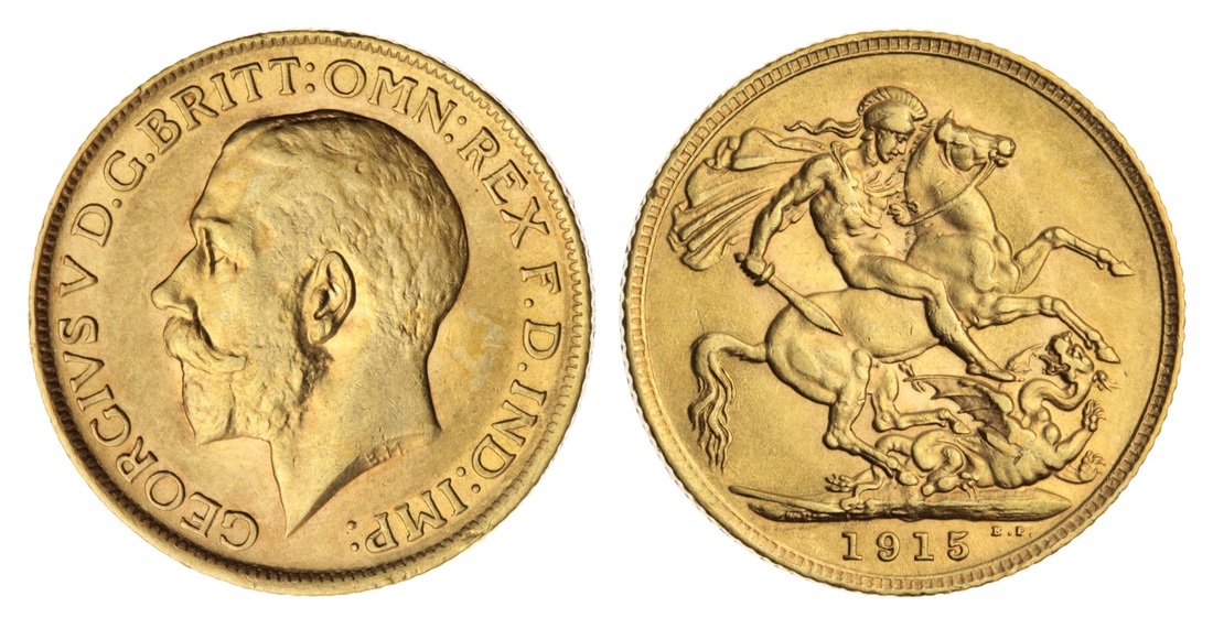 (g) George V (1910-1936), Sovereign, 1915, bare head left, rev. St George and dragon, milled edge, 12h, 7.97g (Marsh 217; Spink 3996), with a most pleasing lustre, especially within the legend, extremely fine