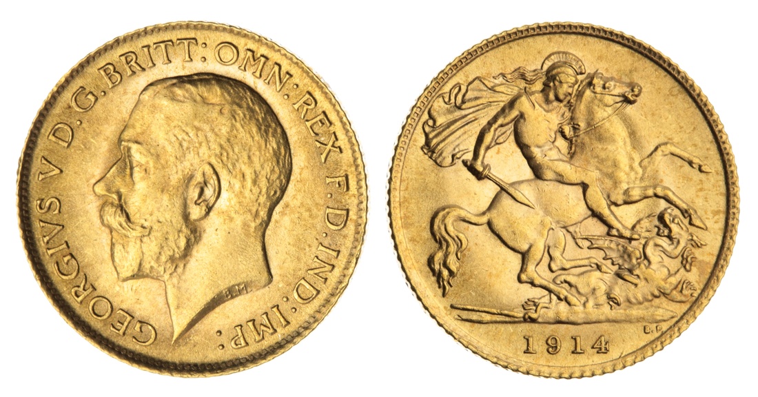 (g) George V (1910-1936), Half Sovereign, 1914, bare head left, rev. St George and dragon, milled edge, 12h, 3.99g (Marsh 529; Spink 4006), some nailmarks below the chin, otherwise lustrous, about extremely fine
