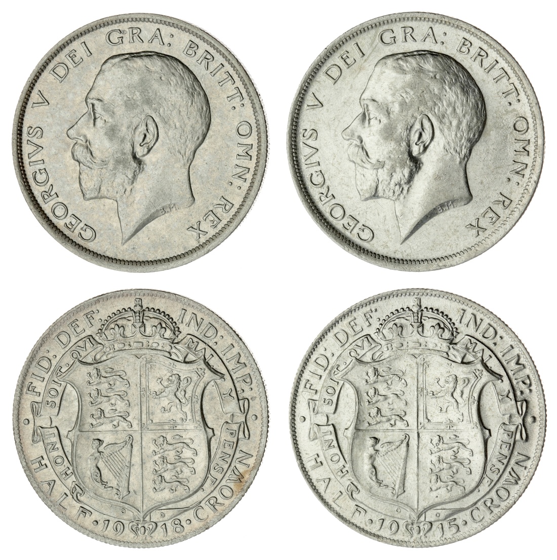 George V (1910-1936), Halfcrown, 1915; 1918, head left, rev. crowned shield within Garter, milled edge, 12h, 14.09g; 14.10g (ESC 762; 766; Bull 3714; 3718; Spink 4011), the first wiped and scratched, very fine, the second lightly bagmarked, nevertheless very lightly toned and lustrous, bolder very fine (2)
