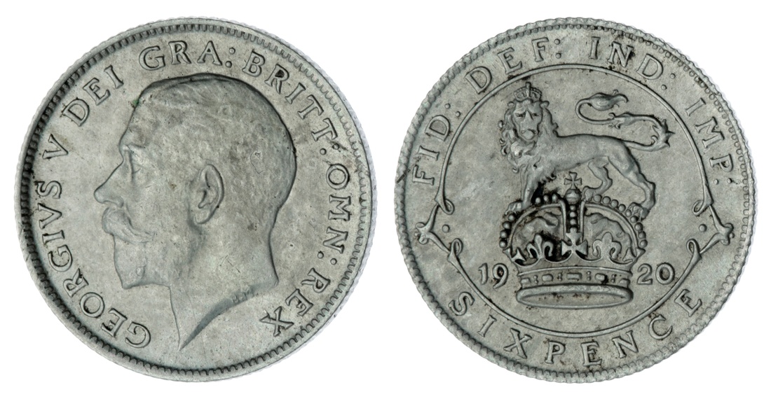 George V (1910-1936), Second Coinage, Sixpence, 1920, bare head left, rev. lion on crown, milled edge, 12h, 2.81g (ESC 1806; Bull 3882; Spink 4024), some deposits to otherwise lightly toned and frosted mint surfaces, uncirculated