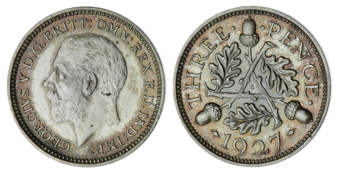 George V (1910-1936), Proof Threepence, 1927, bare head left, rev. three oak springs, plain edge, 12h, 1.42g (ESC 2141; Bull 3946; Spink 4042), small pitted mark to the hair and lightly wiped, otherwise the legend and obverse toned, with hints of brilliance beneath, about extremely fine