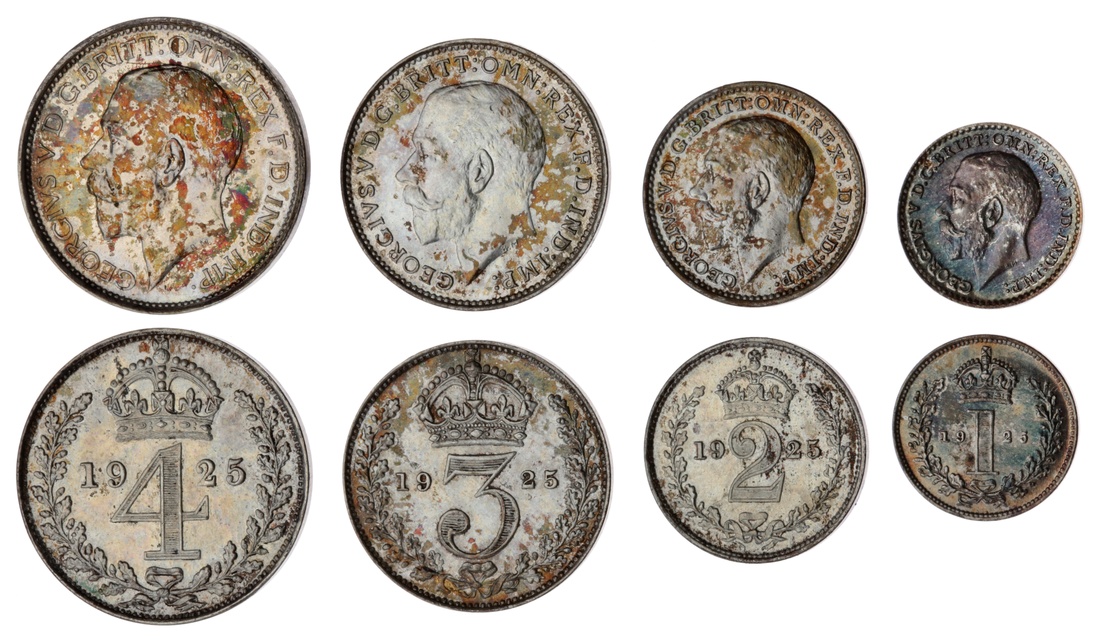 George V (1910-1936), Maundy Set, 1925, bare head left, rev. crowned mark of value, edge plain (Bull 3985; ESC 2542; Spink 4027), patchy toning to otherwise brilliant surfaces, extremely fine, in original case of issue (4)