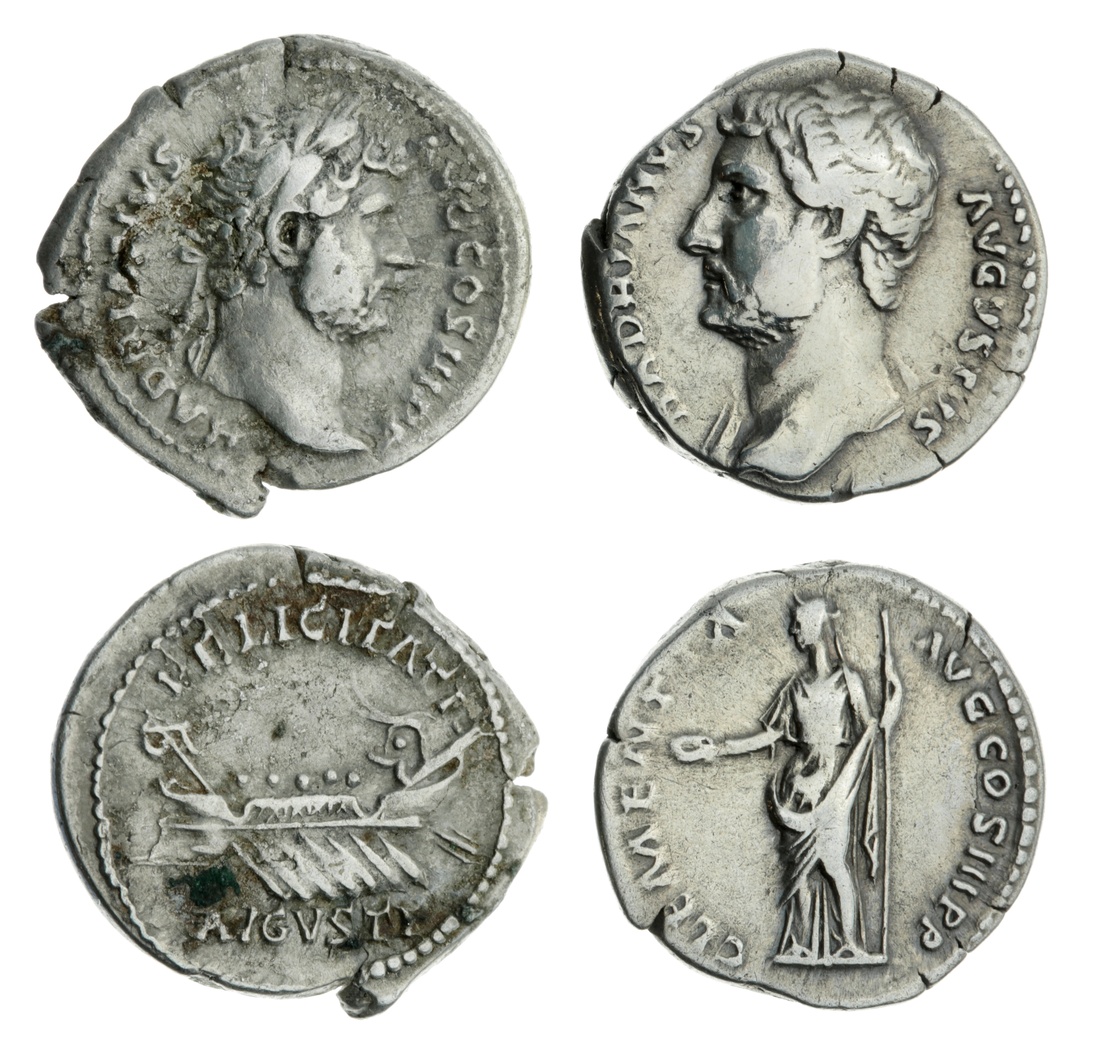 Hadrian (117-138), AR Denarii, Rome (2), ad 129-130, HADRIANVS AVGVSTVS, bare head left, rev. CLEMENTIA AVG COS III P P, Clementia standing left, holding spear and patera, 3.29g, 7h (RIC II, Part 3, no. 1067; BMC 536 note; RSC 219), polished, a bolder fine; another, AD 134-138, HADRIANVS AVG. COS. III. P. P., laureate head right, rev. FELICITAS AVGVSTI across field, Galley sailing left, 3.12g, 1h (RIC 240; BMC 621; RSC 712), striking splits and traces of verdigris, bright but very fine (2)