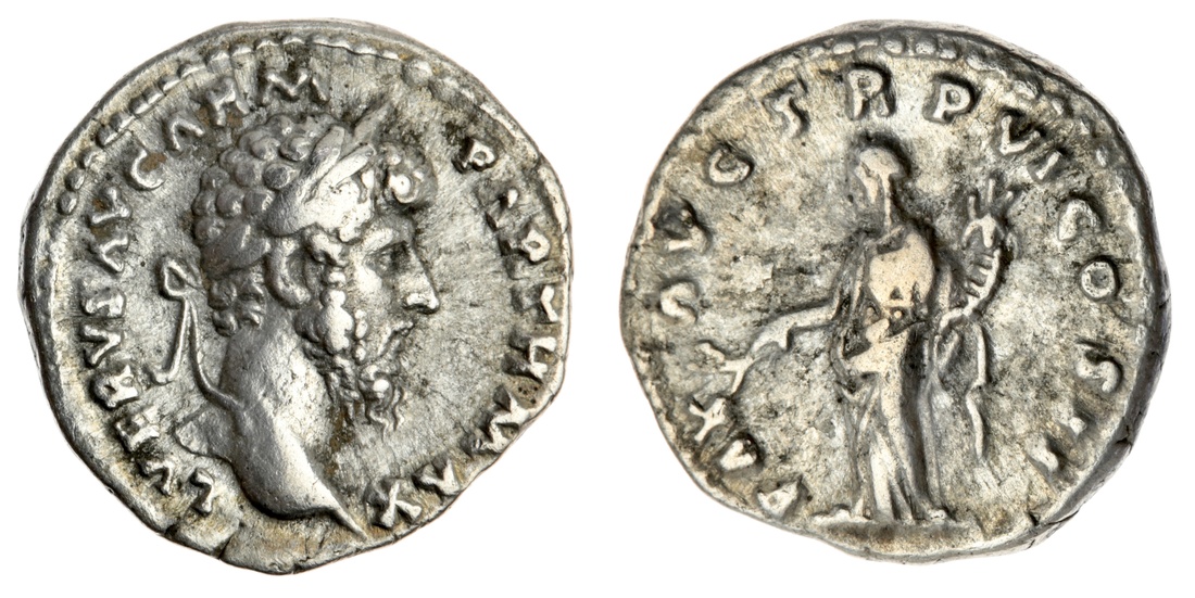 Roman Empire Lucius Verus, 161-169AD, AR Denarius, Laureate bust right, rev. Pax standing left, olive branch and cornucopia in hands, 3.07g (BMCRE 426; RSC 126.) Obv struck in high relief, some slight wear, uneven toning, rev struck from worn dies, good very fine