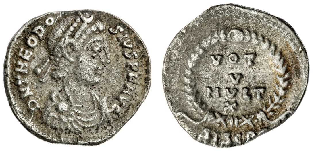 Roman Empire Theodosius I, 379-395AD, AR Siliqua, Pearl Diademed, draped and cuirassed Bust r. rev VOT V MVLT X in laurel wreath, SISCA in exergue, Siscia mint, 1.12g, (C.67 ; RIC.14 b ; RSC.67 a) porosity to surface, soapy toning, good fine