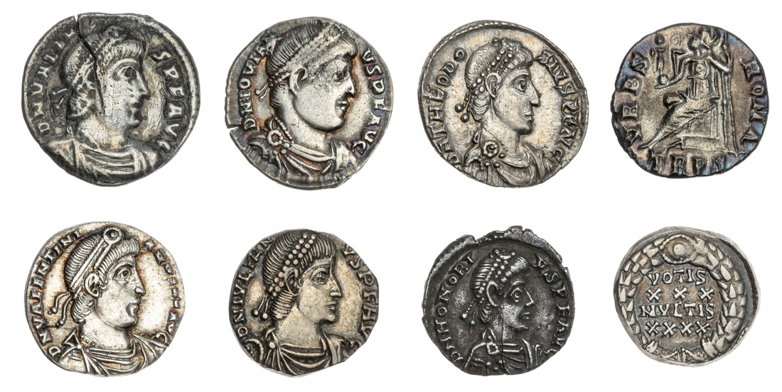 Late Roman, Siliquae (8), 355-361AD, (RIC.133) ; ( II ) Gratian, 367-383AD, (RIC.IX 27f1) ( III ) Honorius, 393-423AD, (RIC 1228 D) ; ( IV ) Valens, 364-378AD, (RIC.IX p.119, 11b2) ; ( V ) Theodosius, 379-395AD, (RIC58b1) ; ( VI ) Jovian, 363-364, (RIC.331) ; ( VII ) Julian II, 360-363AD, (RIC.295) ; ( VIII ) Valentinian I, 364-375AD, (RIC.IX p.119, 11a1), all toned, one with a flan crack, otherwise very fine to extremely fine (8)