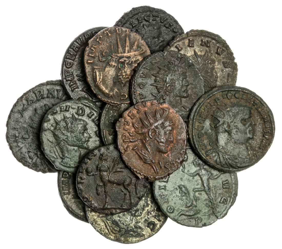 Billon Antoninianii (14), ( I ) Tetricus I, 271-274AD, (RIC.56) ; ( II ) Tetricus I, 271-274AD, (RIC.127) ; ( III ) Gallienus, 253-268AD, (RIC.V.164) ; ( IV ) Severina, 275AD, (RIC.V.164) ; ( V ) Gallienus, 253-268AD, (RIC.494) ; ( VI ) Claudius II Gothicus, 268-269AD, (RIC.V.1.26) ; ( VII ) Quintillus, 270AD, (RIC.V1.58) ; ( VIII ) Aurelian, 274AD, (RIC.V.1.61) ; ( IX ) Numerian, 283-284AD, (RIC.V.2.124) ; ( X ) Carus, 282-283AD, (RIC.V.2.124) ; ( XI ) Diocletian, 284-305AD, (RIC.323) ; ( XII ) Allectus, 293-296AD, (RIC.55) ; ( XIII ) Carausius, 287-293AD, (RIC.513) ; ( XIV ) Probus, 276-282AD, (RIC.V.2.922), fine to very fine (14)