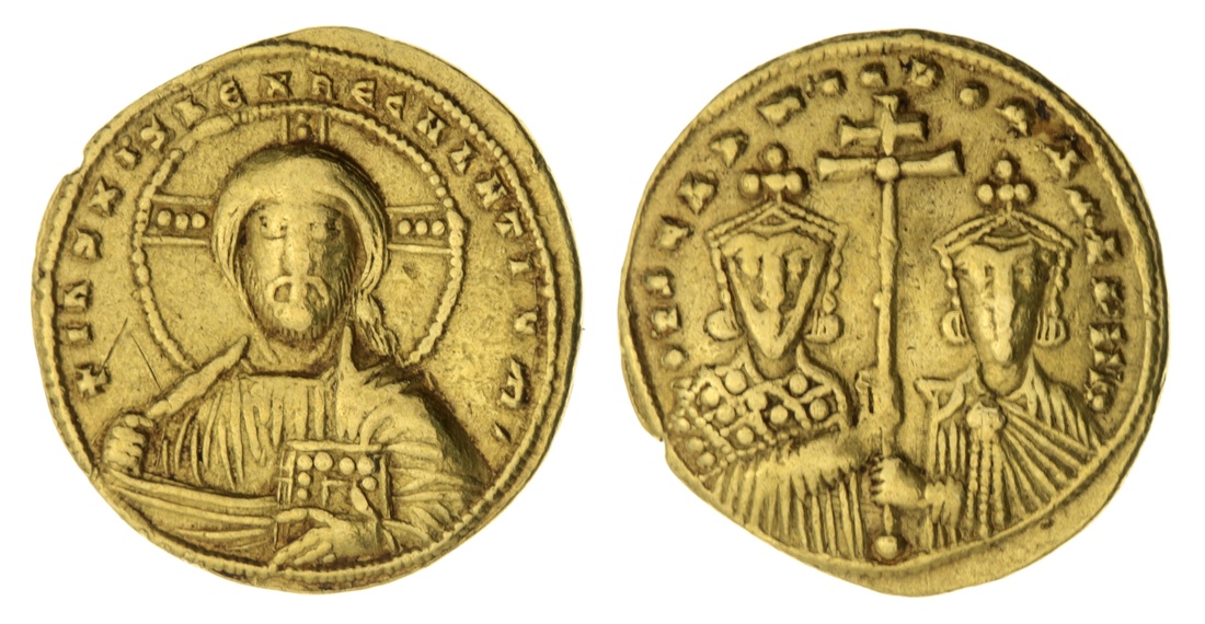 Byzantium, Constantine VII Porphyrogenitus and Romanus II (945-963), AV Solidus, AD 950-955, Constantinopolis, half length bust of Christ facing, wearing nimbus cruciger with three pellets in each limb, pallium and colobium, right hand raised in benediction, book of Gospels cradled in left; single border, rev. crowned facing busts of Constantine VII on left, bearded, wearing loros, and Romanus II on right, wearing chlamys pinned at right shoulder, jointly holding patriarchal cross with globular terminus between them, 4.34g, 6h (Sear 1751), lightly cleaned and rubbed, a bold fine
