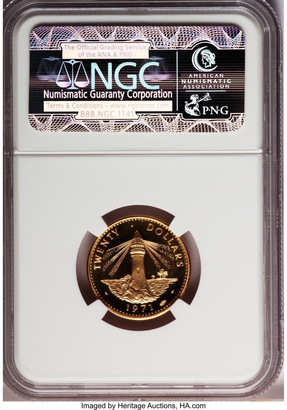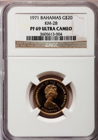 (g) PF69 UCAM | Bahamas, Elizabeth II (1952-2022), Commemorative Gold Proof Twenty-Dollars, 1971, rev. Lighthouse shining, .917 Fine, edge milled, 7.98g, 12h (KM 28), speckling in otherwise brilliant fields, choice uncirculated, in NGC holder, graded PF69 ULTRA CAMEO (#3605613-004)