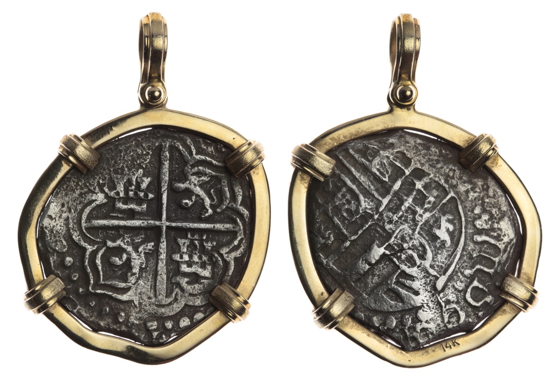 Bolivia, Philip III (1598-1621), 'Nuestra Señora Atocha' 4 Reales, Potosi, crowned shields, rev. arms, 17.93g, in 14 carat mount, with heavily pitted surfaces from water corrosion, the date and assayer not legibile, thus fair and mounted, with Appraisal Cerficiate