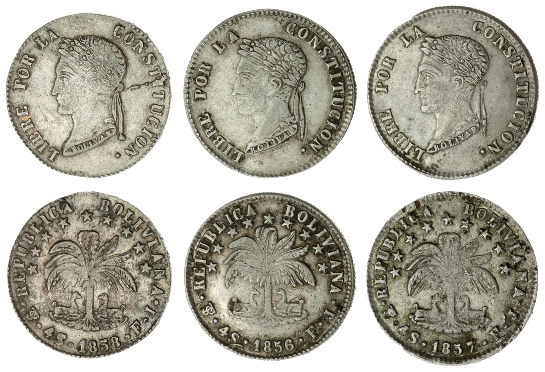 Bolivia, Republic, 4 Soles, 1856 FJ; 1857 FJ; 1858 FJ, Potosi, laureate bust left, rev. alpacas under tree, milled edge, 5h, 13.73g; 5h, 13.40g; 6h, 13.54g (KM 123.2), the first very fine, the second with some verdigris yet very fine, the third with a metal flaw to the obverse field, yet with some toning, very fine (3)