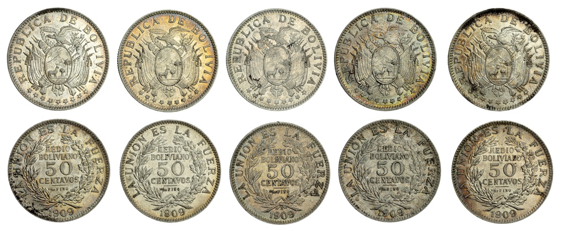 Bolivia, Republic, 50 Centavos, 1909 H, national arms, nine stars below, rev. denomination within wreath, milled edge, 6h (KM 177), some with a handful of contact marks, nevertheless all toned and lustrous, two examples with cartwheel lustre, good very fine to extremely fine (5)