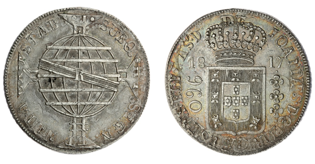 Brazil, João VI (1816-1822), 960 Reis, 1817, Rio de Janeiro, struck over a 8 Reales, 18[??], crowned shield, rev. shield on globe, cross potent behind, security edge, 12h, 26.93g (KM 307.3), previously wiped, yet now with vibrant toning in hues of ochre and blues, faint evidence of the hoist coin to legends and reverse central device, bold very fine