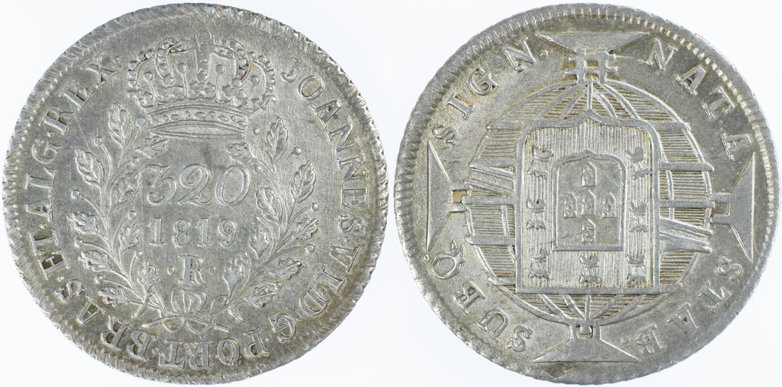 Brazil, João VI (1816-1822), 320-Reis, 1819-R, Rio de Janeiro, crowned denomination within wreath, rev. shield on globe, cross potent behind (KM 324.2), die flaw to reverse at 12 o'clock, otherwise lightly toned, extremely fine and scarce