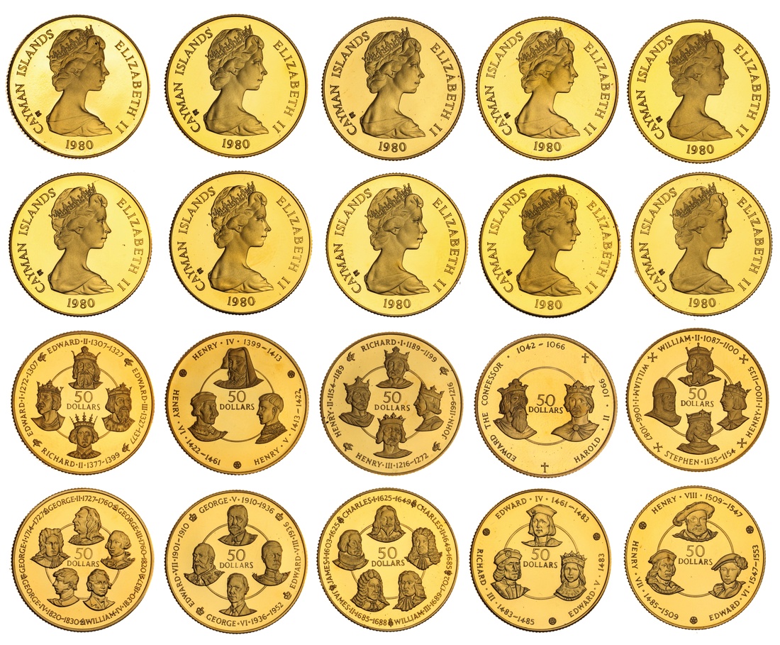 (g) Cayman Islands, Proof 'Kings Collection' Ten Coin Gold Set, Fifty Dollars, 1980, .500 fine gold, crowned head right, rev. the Monarchs of England, milled edge, (KM 58-67), all brilliant and as struck, in original presentation folder in the style of a book, presentation within individual plastic containers (10)