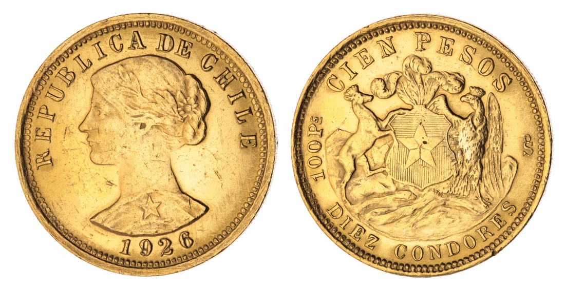 (x) Chile, 100 Pesos, 1926, bust left, rev. coat of arms, denomination above, reeded edge, 6h, 20.34g, (KM 170), cleaned and with some contact marks, otherwise very fine