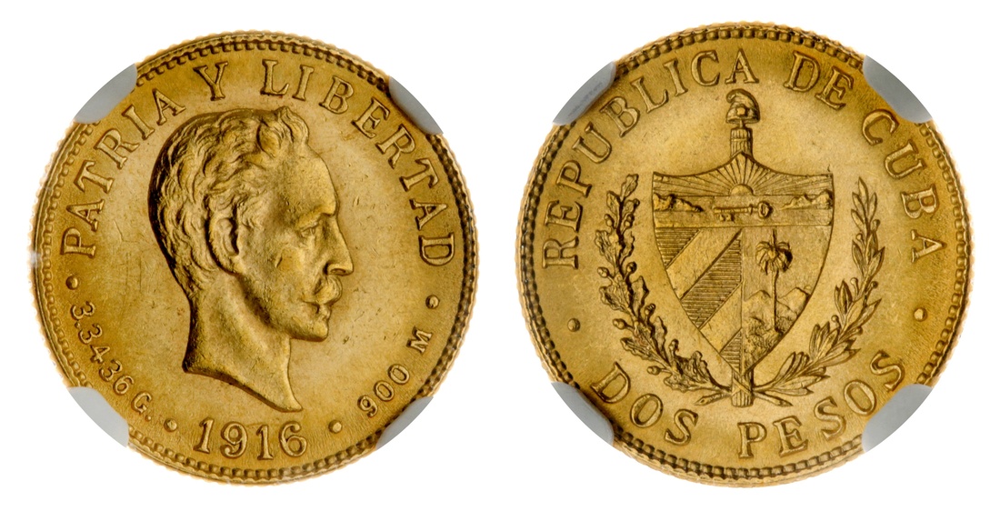 (g) NGC MS62 | Cuba, Republic, Two Pesos, 1916, Philadelphia, milled edge, 6h (Fr 6; KM 17), a handful of light contact marks, otherwise with an attractive lustre, about extremely fine, in NGC holder, graded MS62 (Cert. #2780523-006)