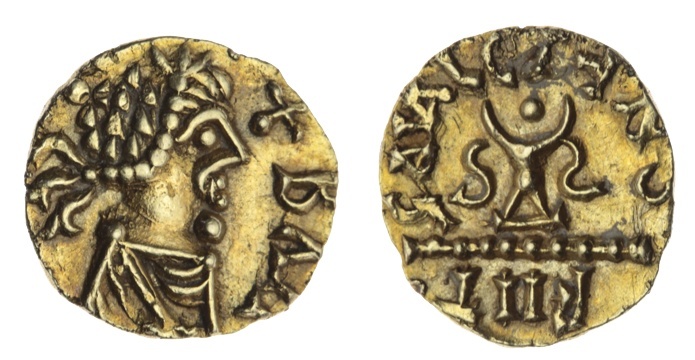 (x) Merovingians Banassac, C. 620-640AD, AU Tremissis, Laureate and draped degenerated bust right, +BA[H] In legend, rev Chalice, with pellet in bowl, FIIT retrograde and flipped in Exergue, GAVLETANO in legend, 1.26g, (Depeyrot.8 ; Belfort.713-7 ; Prou 2086-90) struck in high relief, in celticised roman style, slight porosity at 12:00 on obverse, unlisted and extremely fine