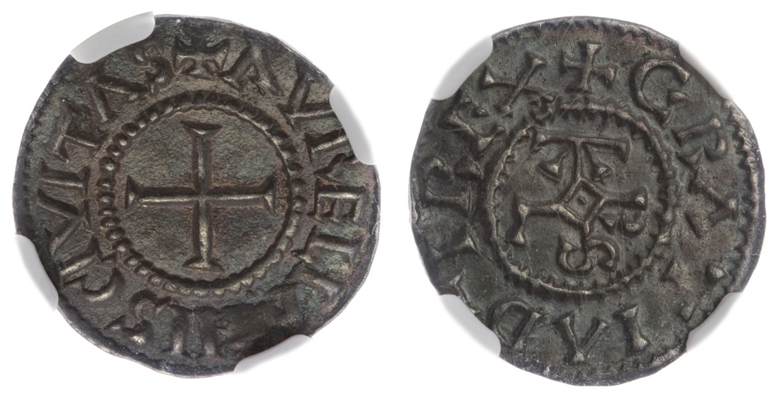 NGC AU58 | France, Carolingian, Charles the Bald (840-877), AR Denier, c. 864-875, Orléans, GRATIAD-REX, KAROLUS Monogram, rev. + AVRELIANS CIVITAS, cross potent, 1.73g, 2h (MEC I, nos. 877-880), richly cabinet toned, extremely fine, in NGC holder, graded AU58 (Cert. #4630965-014)