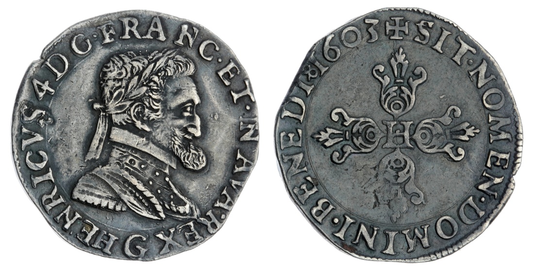 France, Henry IV (1589-1610), Half Franc, 1603 G, Poitiers, laureate and armoured bust right, rev. cross fleuree, m.m cross potent, 11h, 6.92g (KM 14.4), some very faint contact marks to the obverse, otherwise with dark grey toned surfaces, good very fine, scarcer mint
