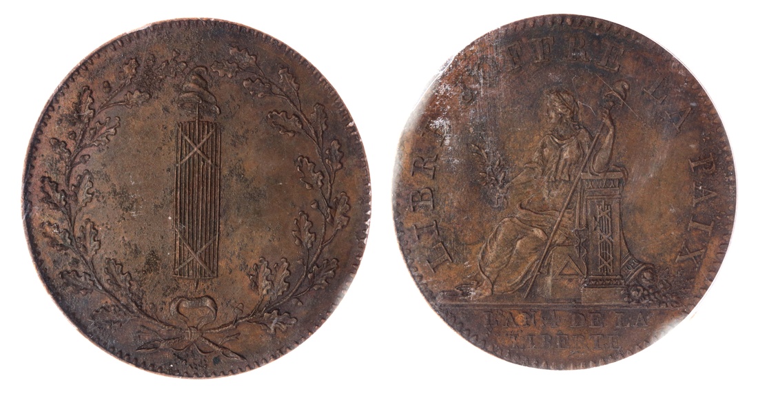 PCGS SP62 BN | France, Constitutional Monarchy (1789-1792), Pattern Essai 5-Franc, An 4 [1792], by Brézin, LIBRE JOFFRE LA PAIX, Liberty seated left, holding pike surmounted by Phrygian cap and olive branch, L'AN 4 DE LA LIBERTE in exergue, rev. fasces surmounted by cap of liberty all in wreath (Hennin 455/-; Mazard 365/372), struck with rusted dies and a patchy tone across even chocolate surfaces, struck details extremely fine, in PCGS holder, graded SP62BN (Cert. #35710778)