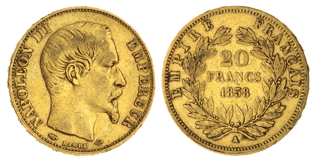 (g) France, Second Empire, Napoleon III (1852-1870) Twenty Francs, 1858 A, Paris, security edge, 6h, 6.43g (Fr 573; KM 781.1), bagmarked and wiped, yet with a glimmer of lustre to the reverse, about very fine