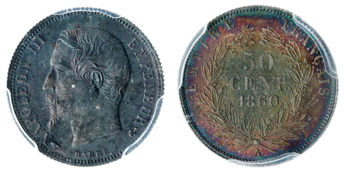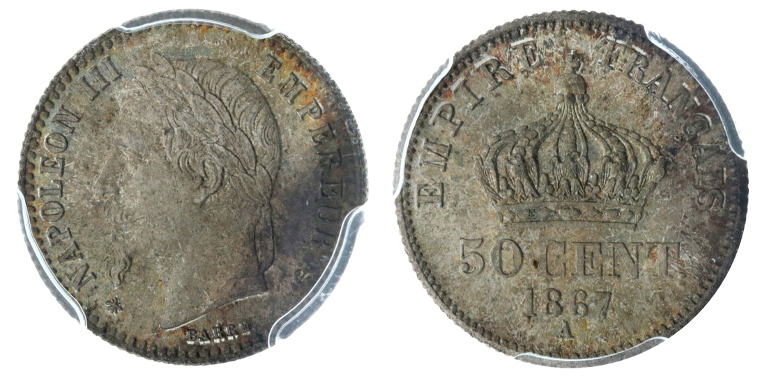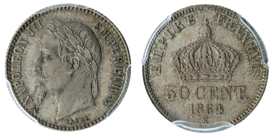 PCGS MS66-MS63 | France, Second Empire, Napoleon III (1852-1870), 50 Centime, 1860 A; 1864 K; 1867 A (KM 794.1; 814.1; 814.3), the first richly and darkly toned, the others pleasingly lustrous, all uncirculated, in PCGS holders, graded MS66-63 (Cert. #196984.63/35475126; 410892.66/81855351; 151364.66/81846637) (3)