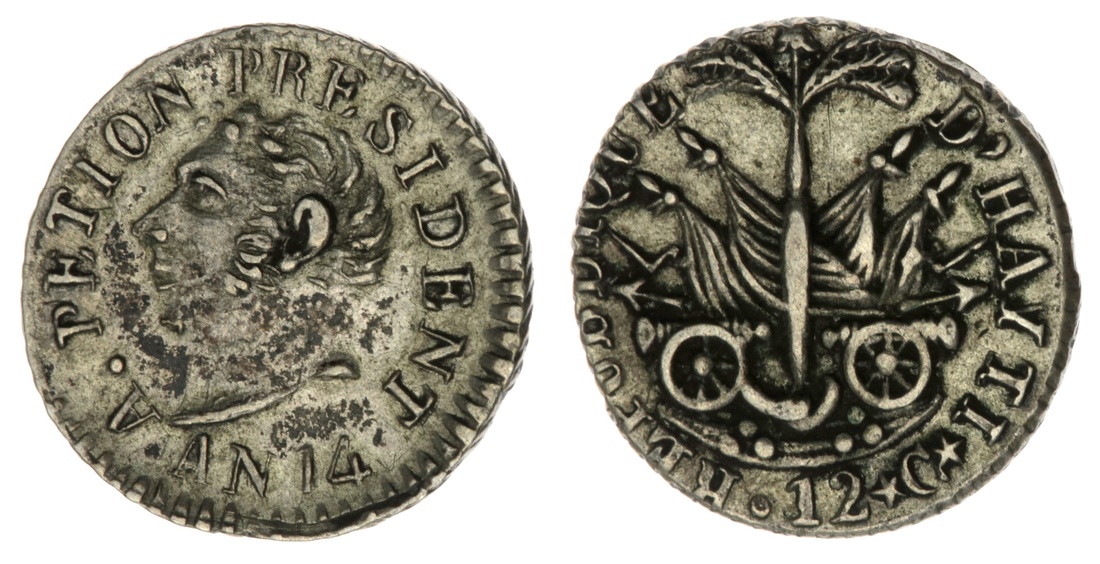 Haiti, 12 Centimes, 'Petion Large Head' type, AN 14 [1817], large head right, rev. Arms of Haiti, obliquely milled edge, 5h, 1.28g (KM 13), some verdigris to the reverse, the obverse with some toning, good very fine, one year of issue type