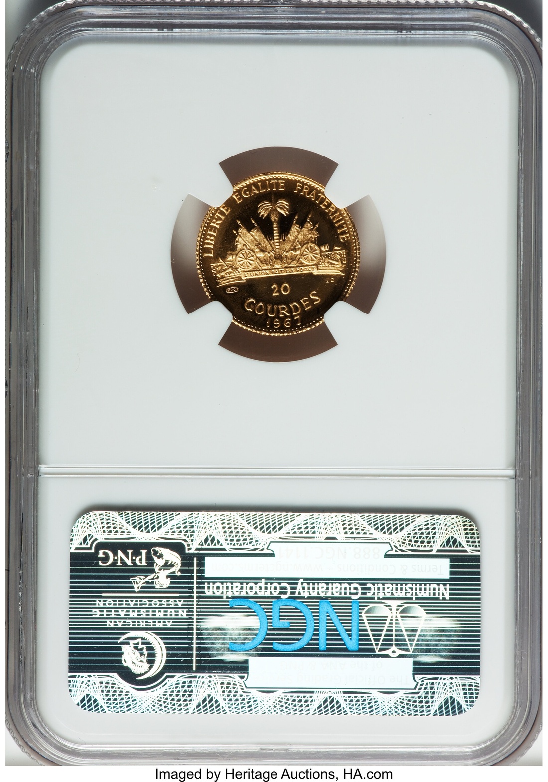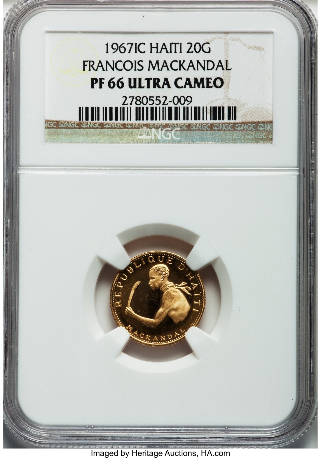 (g) PF66 UCAM | Haiti, Republic, Commemorative Gold Proof 20-Gourdes, 1967-IC, 10th Anniversary of Revolution depicting Francois Mackandal, Haitian left with knife in left hand, rev. National arms, edge milled, 3.95g, 6h (KM 66), a deft fingermark before chin, otherwise brilliant uncirculated, in NGC holder, graded PF66 ULTRA CAMEO (#2780552-009)
