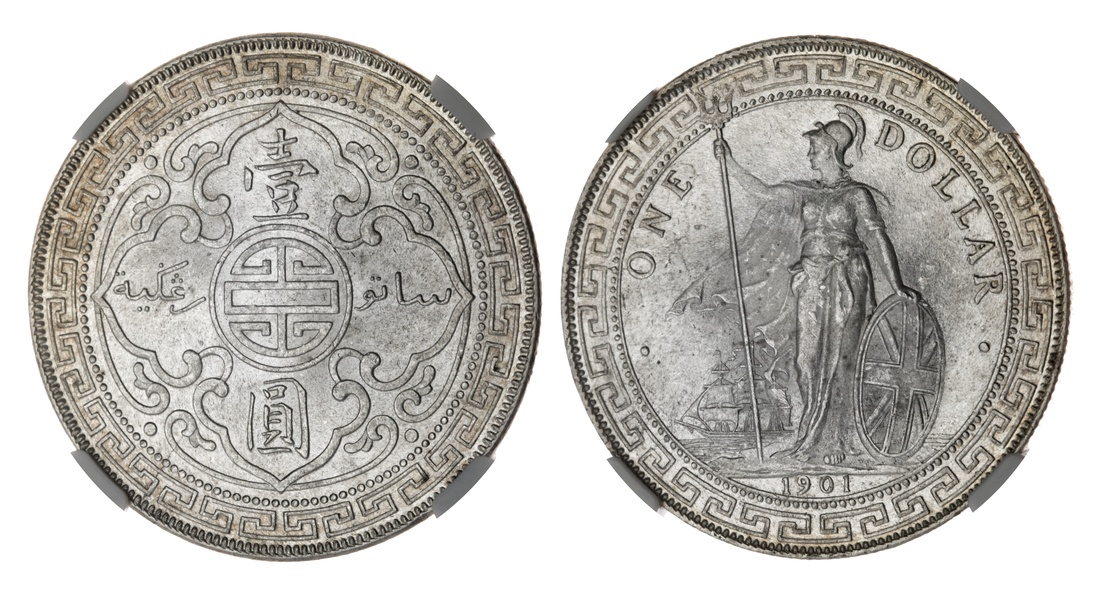 (x) NGC MS63 | British Administration, Hong Kong, Trade Dollar, 1901 $1 B, Bombay, Britannia standing left, holding trident, rev. characters in quatrefoil, edge milled, 12h (KM T5; Pridmore 11), wisps of contact marks in otherwise handsomely choice fields, much as struck, in NGC mid-generation 'Brown' holder, conservatively graded MS63 (Cert # 2771521-014)
