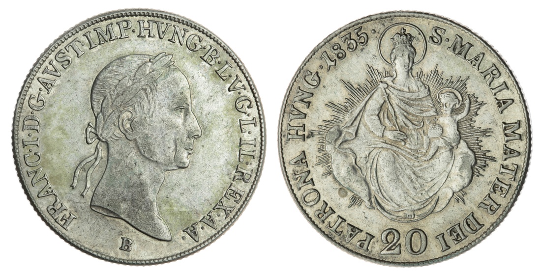 Hungary, Francis II (1792/1804-1835), 20 Krajczar, 1835 B, bust facing right, both ribbons on wreath behind neck, rev. Madonna with child, 6.64g, 12h, (KM 415.3), some toning on obverse, extremely fine