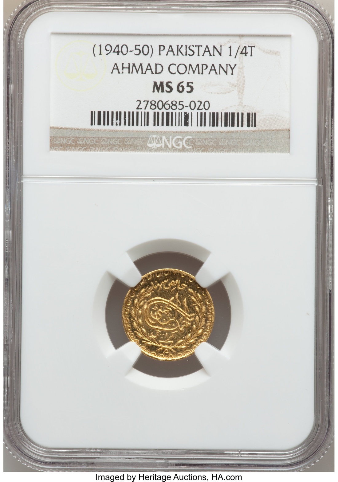(g) NGC MS65 | India, latterly Pakistan, Ahmad & Company (c. 1940-1950), Private Issue, Gold ¼-Tola Token, .995 Fine Gold, edge milled, 10h (KM -), some haziness, otherwise brilliant uncirculated, in NGC holder, graded MS65 (Cert. #2780685-020)