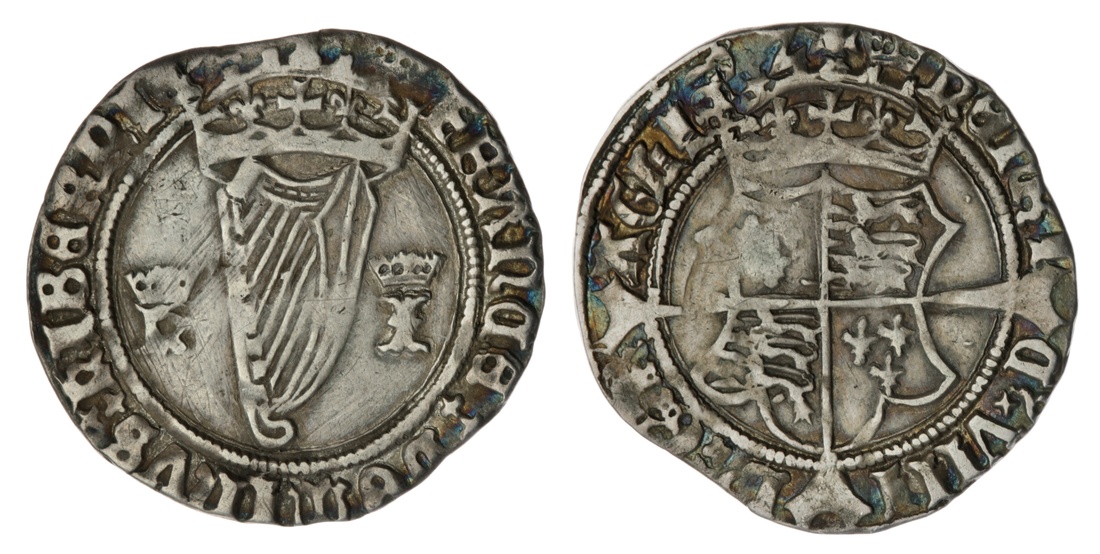 Ireland, Henry VIII, with Jane Seymour (1509-1547), First issue Harp Coinage, Groat, 1536-7, crowed h and I, m.m crown, 5h, 2.36g (Spink 6473), some scratches through obverse field and corresponding flatness to the reverse, richly toned in legends, about very fine