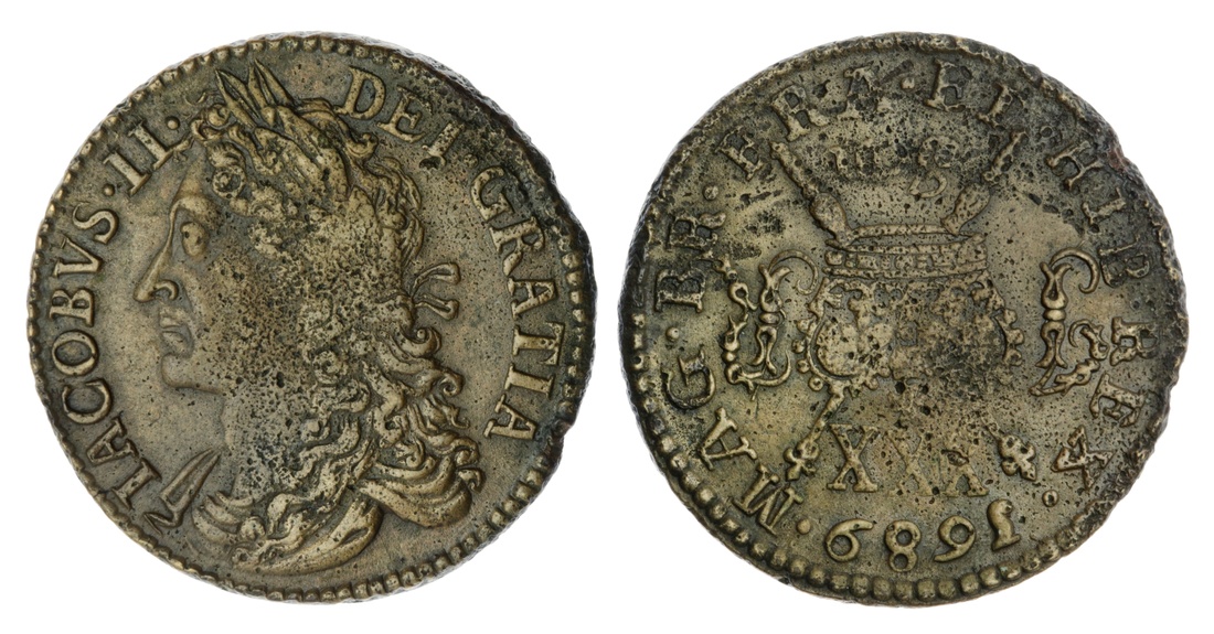 Irish Civil War, James II (1685-1691), 'Gunmoney' Large Halfcrown, January 1689, laureate bust left, rev. pearled crown, cursive date, large fleuron JR, reads Jan, milled edge, 12h, 11.43g (Spink 6579G), with lightly pitted surfaces, otherwise near very fine
