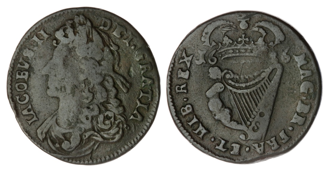 Ireland, James II (1685-1691), Halfpenny, 1686, laureate bust left, rev. crowned harp, plain edge, 11h, 7.11g (Spink 6576), rubbed and pitted, with darkened surfaces, fine