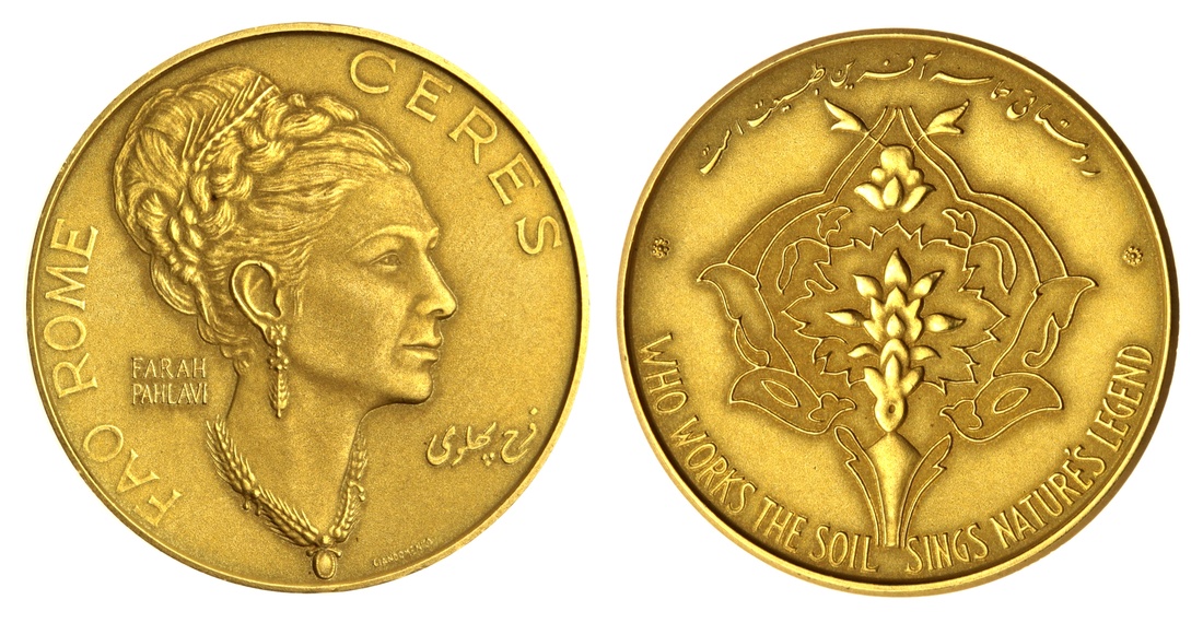 (g) Persia, The Support of the Shah and Shahbanu in the Promotion of Rural Handicrafts and the Development of Agriculture, Gold Medal, 1972, struck in 917 fine gold, by Giano Menico, FAO ROME CERES, bust left of Farah Pahlavi, rev. WHO WORKS THE SOIL SINGS NATURE'S LEGEND, floral decorative design, plain edge, 29mm, 14.91g, with attractive matte surfaces, about as struck