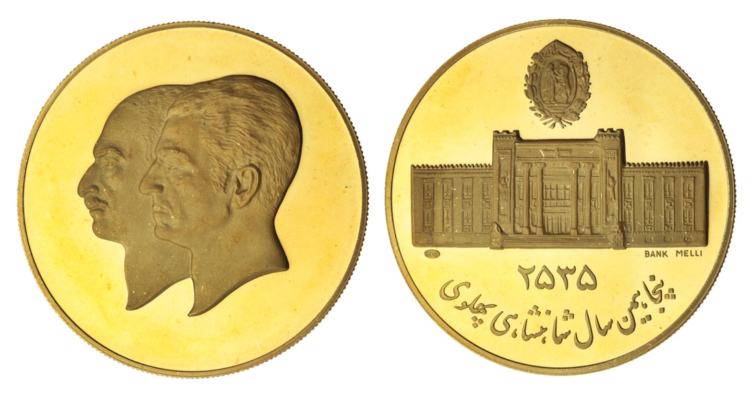 (g) Persia, Pahlavi Dynasty, Mohammad Reza Shah (1941-1979), Proof Gold Medal, Golden Jubilee of the National Bank of Iran, 900 fine gold, MS2535 (1976), conjoined busts of the Shah and his father Reza Shah, rev. bank emblem over facade of the central bank building, milled edge, 39.67g, a handful of very faint fingermarks and hairlines in fields, otherwise some spots of red toning to brilliant fields, practically as stuck, in original case of issue