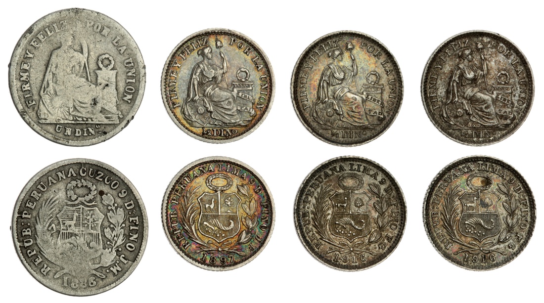 Peru, Dinero, 1886 JM, Cuzco, shield within tied wreath, rev. Liberty seated right, milled edge, 6h (KM 190a), rubbed, fair to fine; Half Dinero, 1897 JF, Lima; 1916, FG, Lima (2), shield within tied wreath, rev. Liberty seated right, milled edge, 6h (KM 206.2), the first with a touch of rub, yet all toned and lustrous, extremely fine (4)