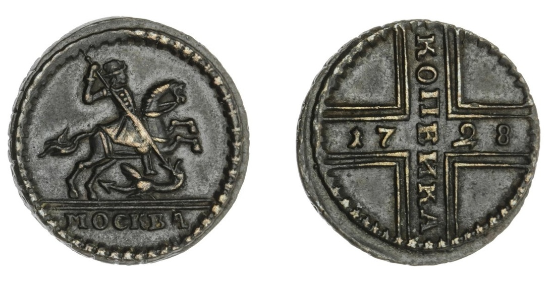 (Tsarist) Russia, Peter II Alekseyevich (1727-1730), Kopek, 1728, Moscow, horseman right, rev. voided cross, incuse edge graining, 3.96g, 7h (Uzd. 2472; Diakov -; Bitkin 197), rub to highest points, otherwise patinated, almost extremely fine, rare